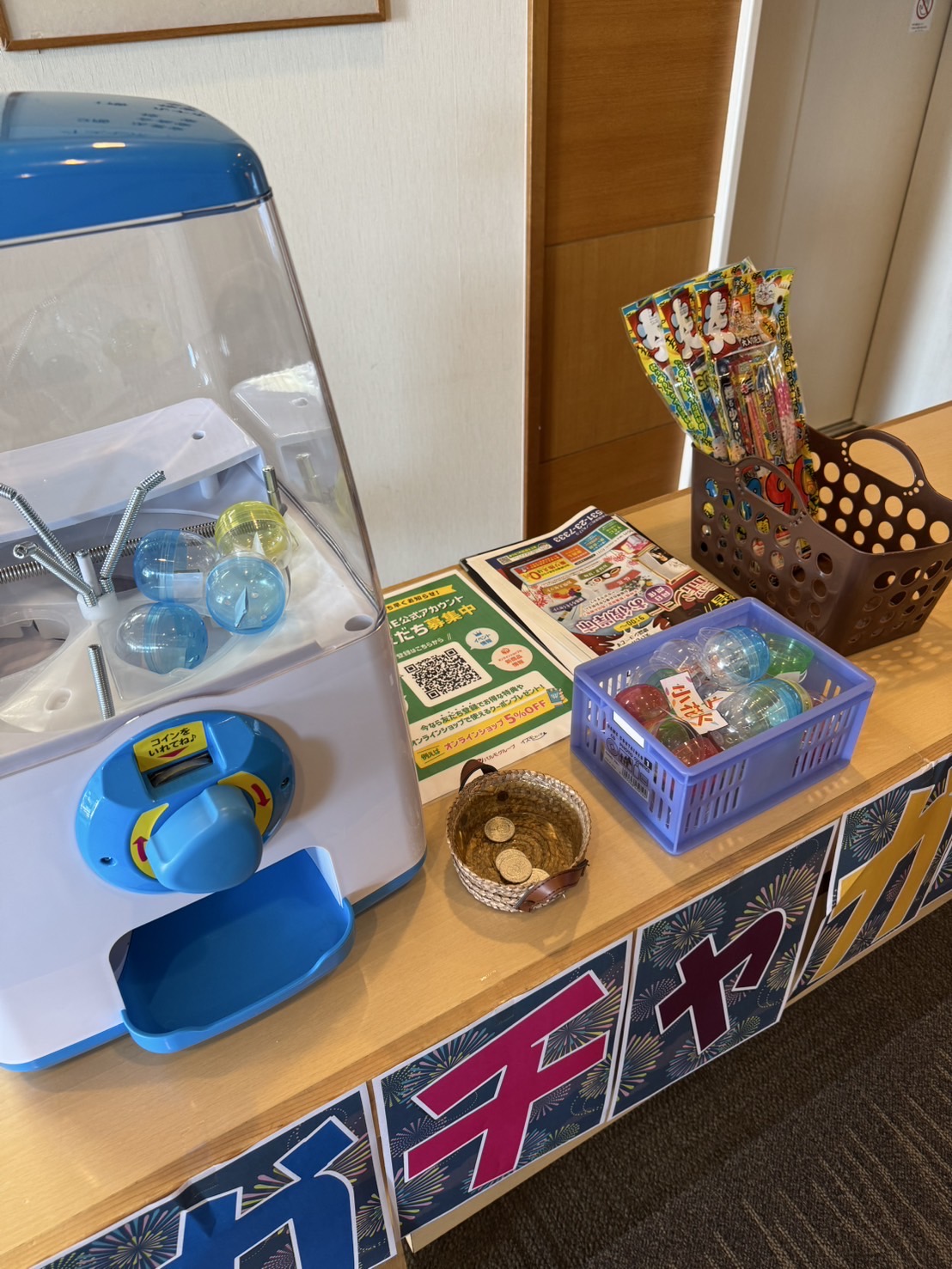 篭盛解体セール、フリーマーケット、ガチャガチャ、野菜や卵の販売など